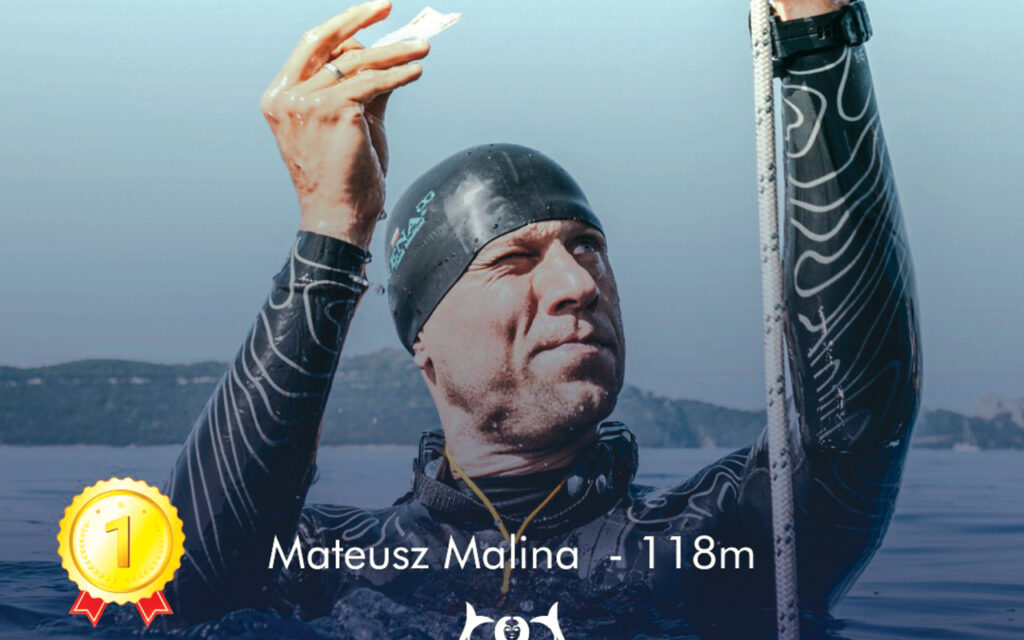 Ostatnio dużo pisaliśmy o tytułach mistrzowskich i rekordach świata, jakie zdobywał Malina. Sukcesy te odnosił w konkurencjach basenowych. Konkurencje głębokościowe to inna odsłona freedivingu. Podczas Mistrzostw w Grecji Mateusz musiał nurkować w głąb morza ze stałym balastem w płetwach (CWT), nurkując bez płetw (FIM) i ze stałym balastem bez płetw (CNF). 9 września w CWT wywalczył brązowy medal, schodząc na głębokość 120 m. Legendarny Alexey Mołczanow osiągnął 130 m, a Giankos z Grecji 125 m. W FIM Polak zdobył złoto, bo zszedł na głębokość 118 m. Giankos i Al Ghailani z Omanu na 113 m, a trzeci wynik osiągnął drugi Polak Piotr Kubiak 111 m. To on zdobył złoto w konkurencji CNF (91 m), pokonał Mołczanowa (90 m) i Malinę (88 m). Tuż przed zamknięciem numeru pojawiła się wiadomość o kolejnym medalu ustroniaka. Wynikiem 116 m zdobył srebro w konkurencji CWTB – nurkowanie bez pomocy liny. Wygrał Mołczanow (120 m), trzeci był Giankos (115 m).