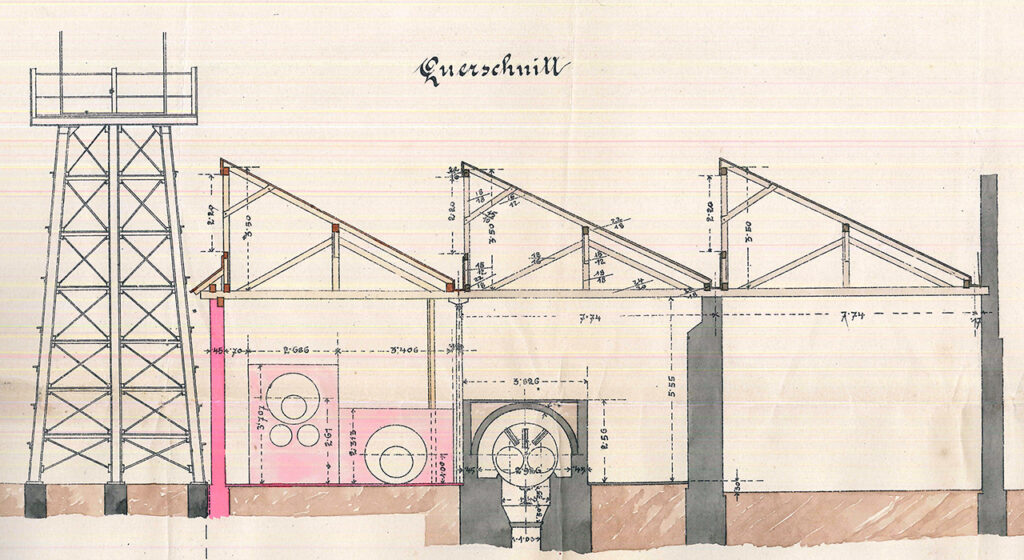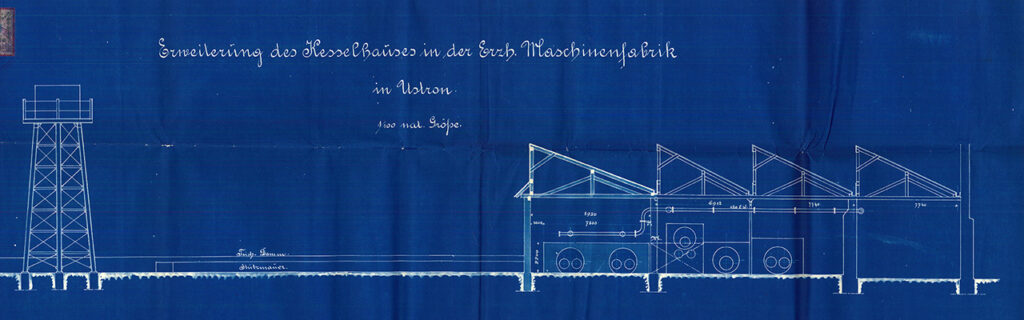 Mieliśmy zatem w Ustroniu w XIX w. wieżę ciśnień, liczącą 14 metrów, a usytuowaną w pobliżu wschodniego brzegu stawu kuźniczego. Nasz muzealny kolega Kamil Podżorski, specjalizujący się w odczytywaniu starych planów, zdradza Czytelnikom bliższe szczegóły: „Na szczycie wieży znajdował się zbiornik z wodą, która zgodnie z zasadą naczyń połączonych transportowana była rurociągiem do znajdującej się 30 m dalej na północ fabrycznej kotłowni”. Sam budynek kotłowni był zresztą nadzwyczaj interesujący – składał się pierwotnie z trzech, a docelowo z czterech oddzielnych pomieszczeń, krytych charakterystycznymi trójkątnymi daszkami przypominającymi zęby. Docelowo w trzech pierwszych, licząc od południa, mieściło się pięć kotłów parowych, w których wytwarzano i magazynowano parę wodną. Jej część kierowano bezpośrednio do młotów parowych, reszta natomiast napędzała maszynę parową, posadowioną w czwartym pomieszczeniu, dobudowanym w 1899 r. Spaliny, powstające w procesie opalania kotłów parowych, trafiały do 36-metrowego komina kotłowni, wzniesionego również w 1899 r. Jeden z planów zdradza nam ponadto, iż w celu wygospodarowania miejsca na kotłownię trzeba było podjąć radykalny krok – przebudować wschodni brzeg stawu i przesunąć go 8 metrów na zachód, zmniejszając nieco rozmiar zbiornika.