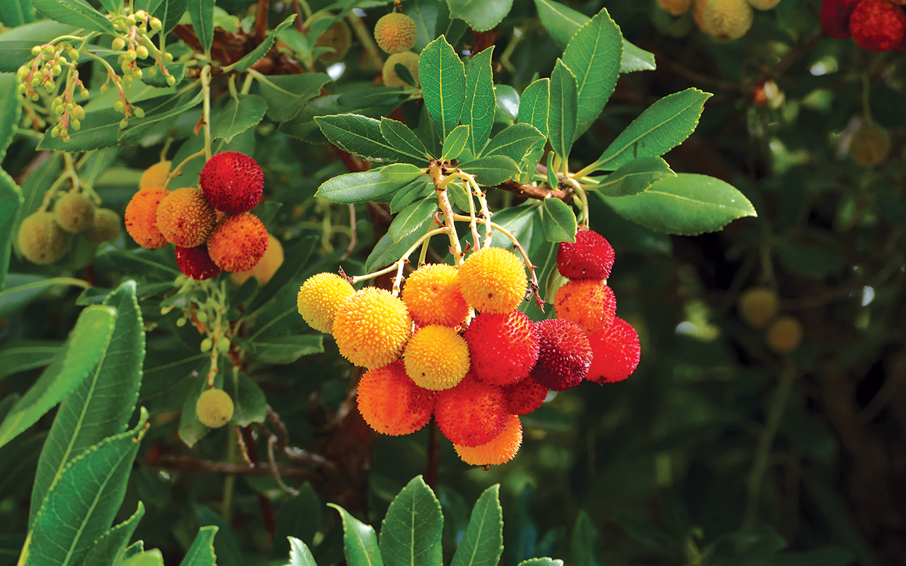 i krótkotrwałe, więc muszę dać wiarę opisom, wedle których początkiem jesieni ich korony przyozdabiają kwiatostany z licznych, drobnych i dzwonkowatego kształtu kwiatów, przeważnie białych lub jasnoróżowych, wydzielających intensywny, bardzo przyjemny zapach. Kwitnienie trwa nieprzerwanie do połowy zimy, a wiosną po zapyleniu (drzewo truskawkowe jest rośliną nektarodajną, a aromatyczny i gorzkawy miód ma ciemną barwę) miejsce kwiatów zajmują owoce niemal kulistego kształtu i o średnicy do 2 centymetrów. Ich skórka ma barwę w różnych odcieniach żółtego, pomarańczowego lub czerwonego, a miąższ jest żółtawy lub pomarańczowy. Owoce dojrzewają długo, utrzymują się na drzewach aż do kolejnej jesieni, bywa więc i tak, że w koronach poziomkowców zobaczyć można rosnące w jednym czasie i po sąsiedzku tak kwiaty, jak i owoce. Te ostatnie moim zdaniem bardziej przypominają owoce liczi niż truskawki lub poziomki, a ich smak może i ma jakieś truskawkowo-poziomkowe nuty (choć niektórym przypomina nawet brzoskwinię i mango), ale w moim odczuciu jest wybitnie słodkawo-mdły i jakiś taki… mało szlachetny. Mimo to uchodzą za owoce jadalne na surowo, a z pewnością nadają się na różne przetwory – nie tylko dżemy czy konfitury, ale także wina i likiery (m.in. portugalski tyleż likier, co rodzaj brandy Aguardente de Medronhos).