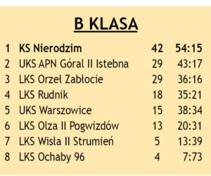W niedzielę 2 listopada odbył się w Nierodzimiu mecz tamtejszego Klubu Sportowego z LKS-esem Zabłocie. Spotkanie zakończyło się jak wszystkie do tej pory zwycięstwem ustrońskiego zespołu tym razem 3:0. To był ostatni mecz rundy jesiennej Klasy B Podokręgu Skoczów. Nierodzim rozegrał 14 meczy i odniósł 14 zwycięstw, zdobywając 54 bramki (24 na własnym boisku, 30 na wyjeździe), tracąc jedynie 15 (u siebie 6, na wyjeździe 9).