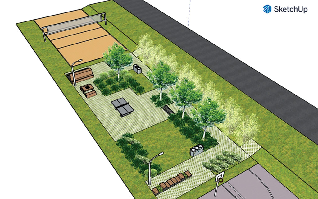 Zielona przestrzeń dla mieszkańców znajdzie swoje miejsce pomiędzy boiskiem do piłki nożnej a boiskiem do siatkówki plażowej. Przewidziano nasadzenia drzew i krzewów, roślin