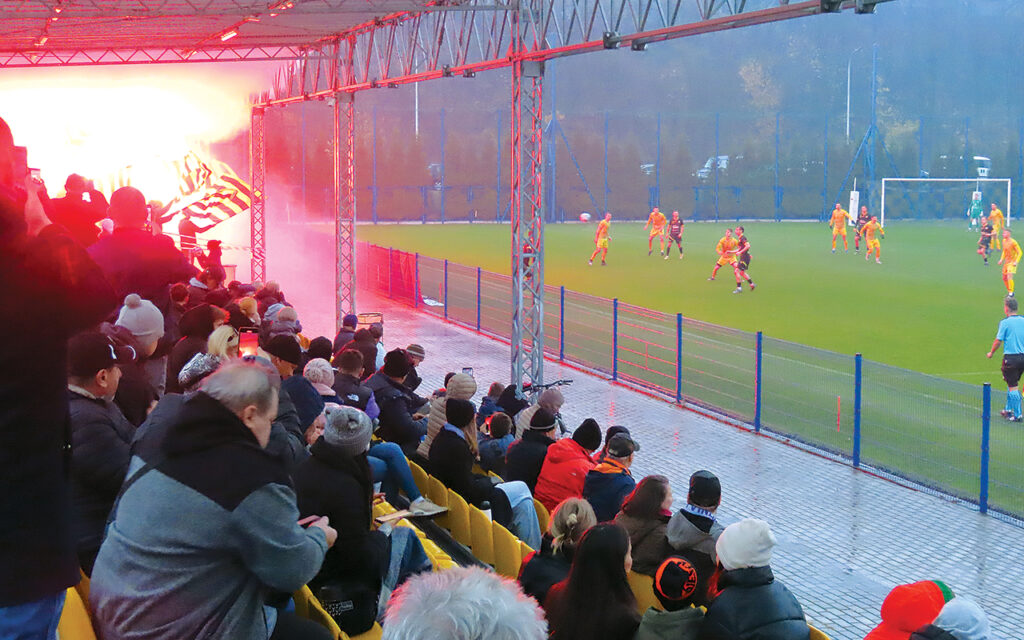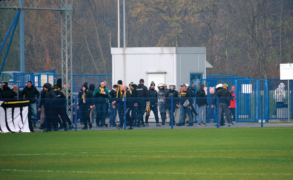 Taka właśnie grupa kibiców pojawiła się razem z zespołem Ruchu Radzionków na ustrońskim stadionie w sobotę 8 listopada. Powiewały żółto-czarne flagi, napinały się szaliki i banery, ponad murawą niosły się pieśni, a rytm okrzyków wyznaczały uderzenia w bęben. Po pierwszej bramce strzelonej przez Kuźnię zapłonęły race z czerwonym, a następnie zielonym dymem, za to z głośników dał się słyszeć komunikat, że używanie materiałów pirotechnicznych na stadionie jest zakazane. Trzeba przyznać, że kibice Radzionkowa zachowywali się stosunkowo spokojnie, trzymali się swoich miejsc i cały mecz przebiegłby bez zakłóceń, gdyby nie mężczyźni, którzy na początku meczu weszli na stadion. Było ich sześciu, a sądząc z akcentu, przyjechali z Górnego Śląska. Byli to prawdopodobnie kibice jakiegoś rywalizującego z Radzionkowem klubu, czyli takiego, z którym ma „kosę”. Po wejściu na stadion zaczęli agresywnie zaczepiać kibiców zajmujących miejsca na trybunach. Część z nich ruszyła na intruzów, doszło do przepychanek i bójki, ale w tym momencie zainterweniowali pracownicy ochrony. Musieli użyć pałek by zmusić prowokatorów do opuszczenia obiektu i w ten sposób nie dopuścili do bitwy i prawdopodobnie uratowali awanturników. Dopiero chwilę później pojawili się uzbrojeni policjanci w specjalnym rynsztunku i dokończyli dzieła, zaprowadzając spokój na stadionie. Mecz został wznowiony, ale pracownicy Cienciała Protect pozostawali czujni. Na szczęście, ponieważ po ostatnim gwizdku, znów pojawił się jeden z mężczyzn, został przegoniony ze stadionu. Odszedł do swoich kompanów, czekających na niego na ławce nad Wisłą. Chwilę później zjawił się patrol policji, żeby wylegitymować i przepytać mężczyzn, którzy zrobili tyle zamieszania podczas meczu Kuźni.