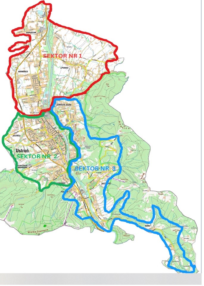 Odśnieżanie obszaru całego miasta, w którego skład wchodzą dzielnice o charakterze ulic o małym nachyleniu tj.: Nierodzim, Lipowiec, Hermanice, Goje, Zawodzie Dolne, Zawodzie Górne i dzielnice w których znajdują się drogi typowo górskie o dużym nachyleniu takie jak: Polana, Dobka, Jaszowiec, Poniwiec. Odśnieżanie chodników i dróg do budynków należących do zasobów Miasta Ustroń zostało podzielone na III sektory (szczegóły w załączniku nr 1 do operatu).