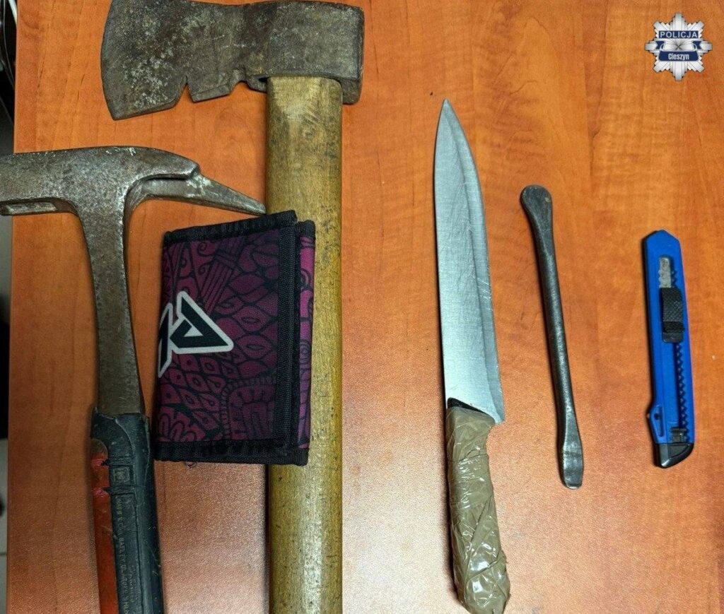 Podczas interwencji mężczyzna posiadał przy sobie niebezpieczne narzędzia – noże oraz siekierę. Został obezwładniony przez policjantów i zatrzymany, a następnie doprowadzony